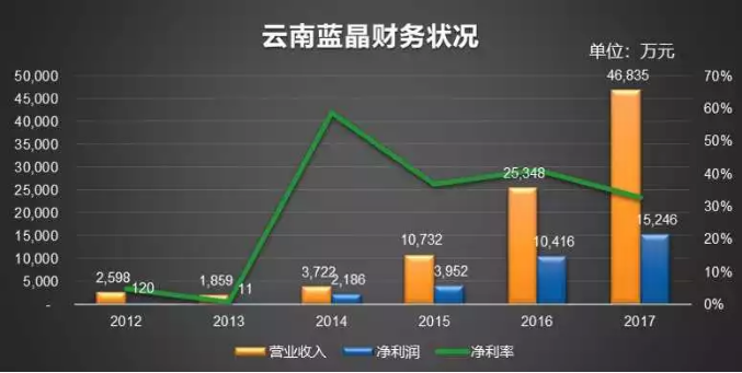 從公開的歷年中報數(shù)據(jù)上看,并購后,云南藍晶的主營收入和凈利潤逐年大幅攀升,其他方面也表現(xiàn)突出,例如,毛利率基本維持在40%左右,凈利率也在25%以上,給華燦光電增色不少。