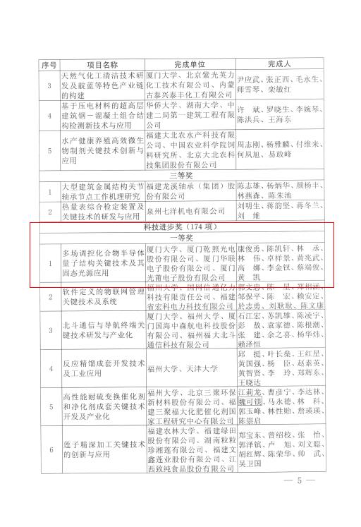 2018年10月31日,福建省人民政府發(fā)文公布2017年度福建省科學(xué)技術(shù)獎(jiǎng)勵(lì)和專利獎(jiǎng)勵(lì)的決定。其中乾照光電與廈門大學(xué)、廈門華聯(lián)電子股份有限公司、廈門光莆電子股份有限公司聯(lián)合申報(bào)的“多場(chǎng)調(diào)控化合物半導(dǎo)體量子結(jié)構(gòu)關(guān)鍵技術(shù)及其固態(tài)光源應(yīng)用”從454項(xiàng)科技進(jìn)步獎(jiǎng)項(xiàng)目中脫穎而出,榮獲福建省科技進(jìn)步獎(jiǎng)一等獎(jiǎng)。