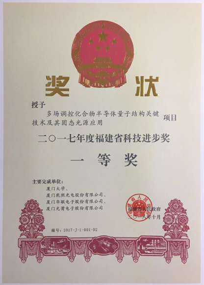 八、10月31日,福建省人民政府發(fā)文公布《2017年度福建省科學(xué)技術(shù)獎(jiǎng)勵(lì)和專利獎(jiǎng)勵(lì)的決定》。乾照光電與廈門大學(xué)、廈門華聯(lián)電子股份有限公司、廈門光莆電子股份有限公司聯(lián)合申報(bào)的“多場(chǎng)調(diào)控化合物半導(dǎo)體量子結(jié)構(gòu)關(guān)鍵技術(shù)及其固態(tài)光源應(yīng)用”從454項(xiàng)科技進(jìn)步獎(jiǎng)項(xiàng)目中脫穎而出,榮獲福建省科技進(jìn)步獎(jiǎng)一等獎(jiǎng)。