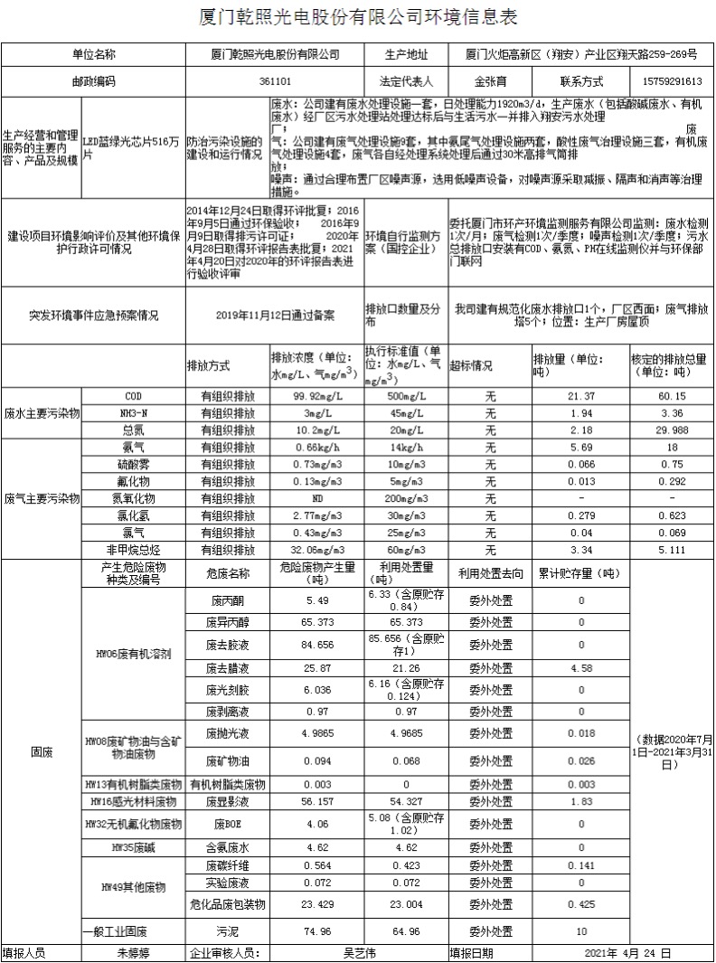 廈門乾照光電股份有限公司環(huán)境信息表