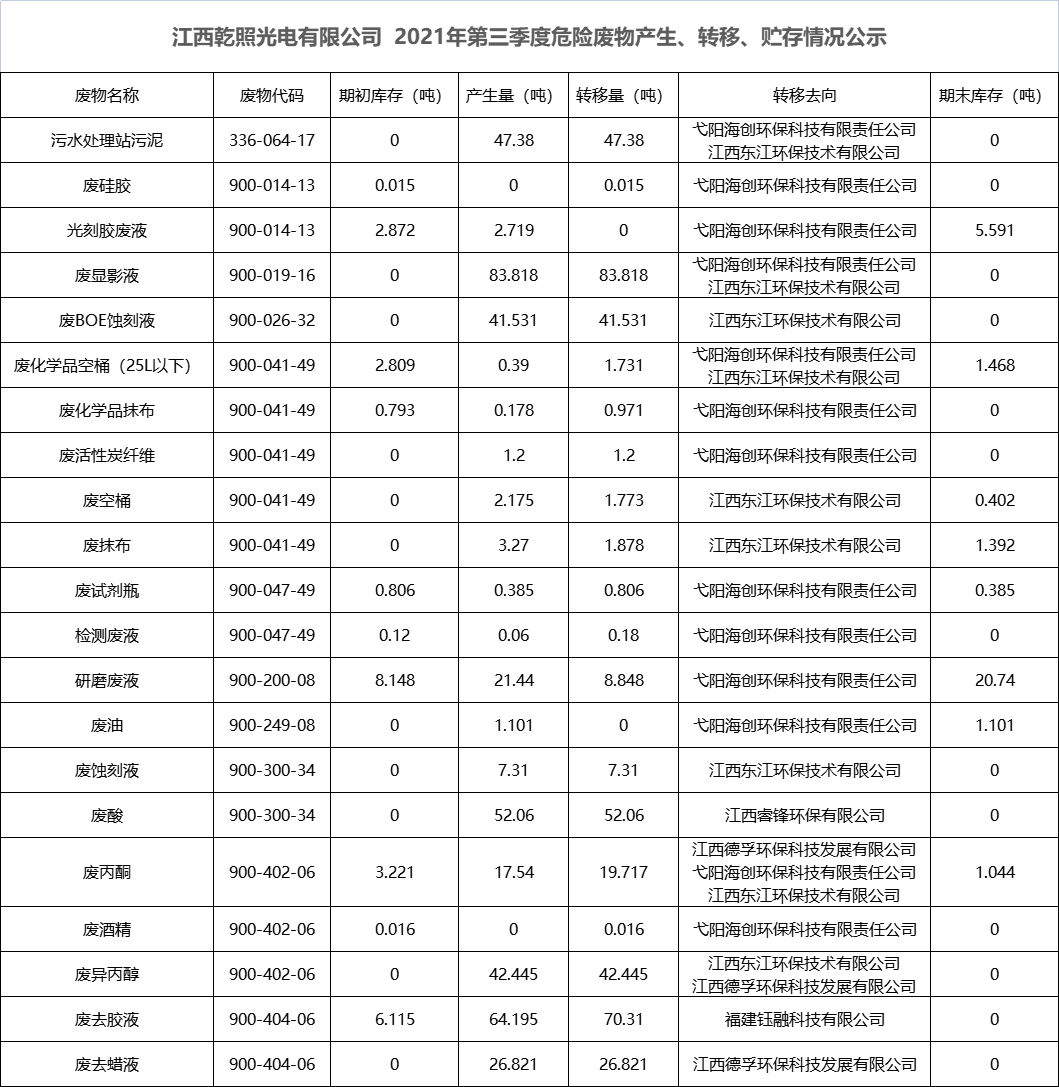 江西乾照光電有限公司 2021年第三季度危險(xiǎn)廢物產(chǎn)生、轉(zhuǎn)移、貯存情況公示