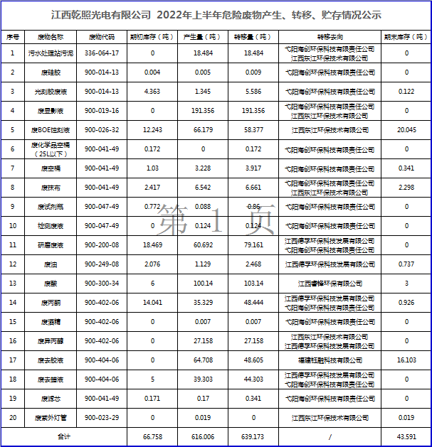 江西乾照光電有限公司2022年上半年危險廢物產(chǎn)生、轉(zhuǎn)移、貯存情況公示