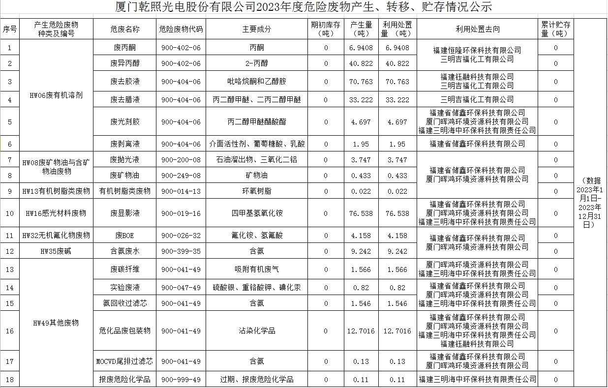 廈門乾照光電股份有限公司2023年度危險廢物產(chǎn)生、轉(zhuǎn)移、貯存情況公示