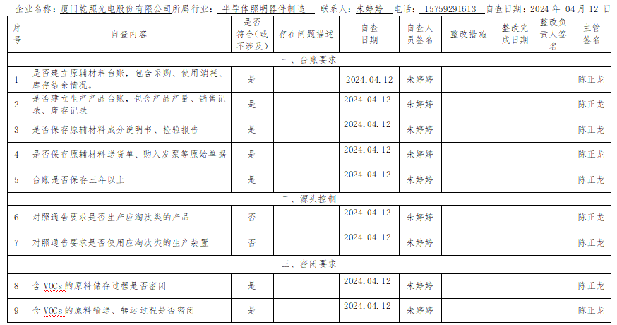 廈門市揮發(fā)性有機(jī)物污染防治企業(yè)自查表(本企業(yè)對(duì)表格數(shù)據(jù)內(nèi)容負(fù)責(zé)) 企業(yè)名稱:廈門乾照光電股份有限公司所屬行業(yè):半導(dǎo)體照明器件制造 聯(lián)系人:朱婷婷 電話:15759291613自查日期:2024年04月12日 ...