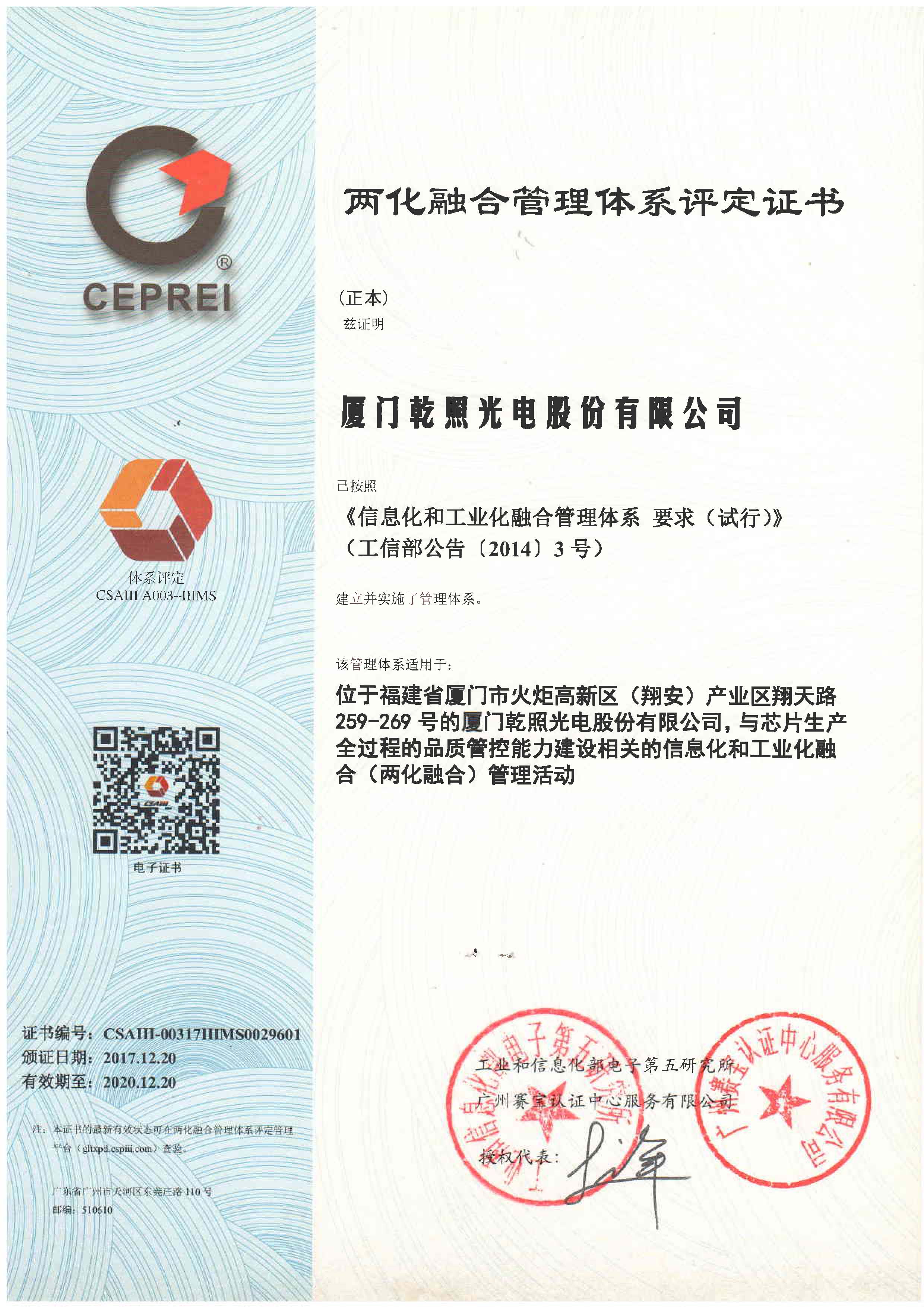 2017年12月20日,廈門乾照光電股份有限公司獲得兩化融合管理體系評定證書。這標(biāo)志著乾照光電已建立起兩化融合管理體系,并在推進信息化和工業(yè)化深度融合方面取得顯著成效,在公司戰(zhàn)略轉(zhuǎn)型、組織變革、管理創(chuàng)新、技術(shù)融合和...