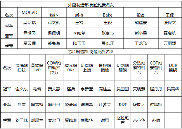 外延崗前比武項目涉及機臺組取放片、質檢組鐳刻+測試、物料組發(fā)料PVD操作、Bake組烤爐、工程組硬件、控制率,設備組球閥、過濾器清理等項目。芯片技能比賽項目包括清洗站掃膠、蒸鍍站CVD、COW站自動推拉力、黃光站DNK、研磨站上蠟、目檢站鏡檢、切割站翻膜、分選站索特機臺、COT站豪勉機臺、DBR鍍鍋等。經過多輪比拼,最終46位選手脫穎而出,榮獲各項冠亞季軍。
